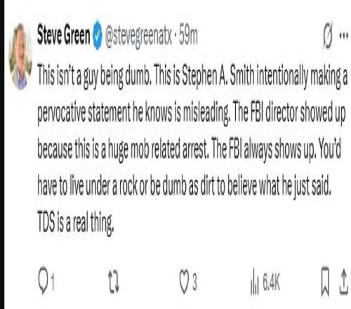 然而,就在全国震惊之际,著名体育评论员Stephen A. Smith在节目《First Take》中掀起更大争议。他在直播中怒斥,这场FBI行动“不是巧合,而是川普政治操盘的一部分”。