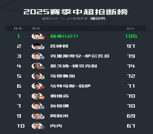 2025中超抢断榜:西海岸杨希以105次居首,英博吕焯毅排第二
