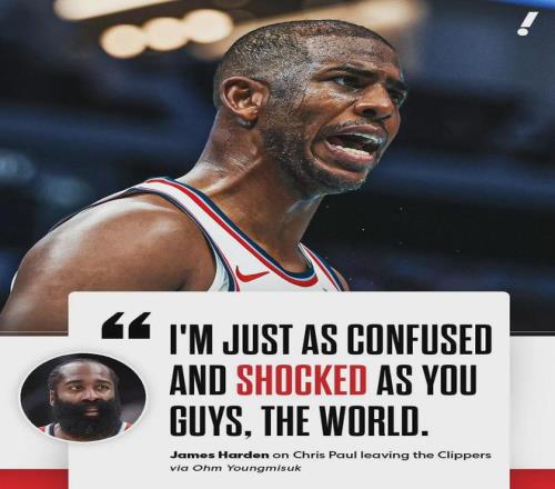 之前哈登回应保罗突然和快船分手一事时,说道:“睡醒看到新闻,我跟全世界一样感到震惊困惑。”