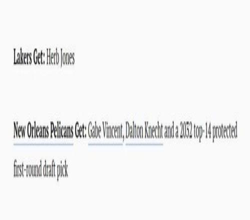 鹈鹕得到:文森特+克内克特+湖人32年前14顺位保护首轮签。