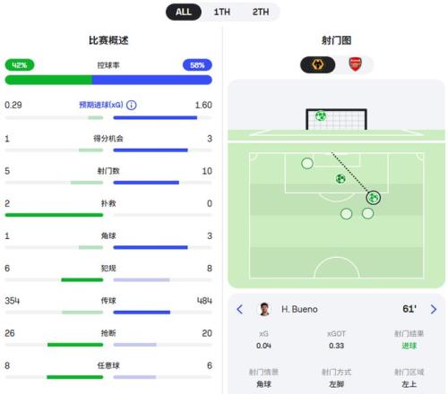 其实狼队全场比赛也仅有5次射门,第一脚射门更是出现在上半场的补时阶段。结果他们最后2脚射门都进球了,更不可思议的是,61分钟的那个进球,预期进球仅有0.04。