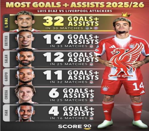 2025/26赛季进球+助攻最多(迪亚斯vs利物浦攻击手)