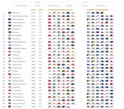 其中掘金与雷霆难度高居前二值得关注,尤其是考虑到两支球队还将3次正面相遇,这三场比赛的结果不仅将影响两队潜在对决的心理优势,也将极大影响西部最终的排名局势。