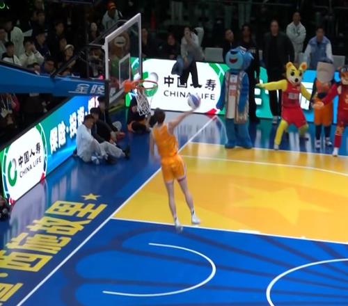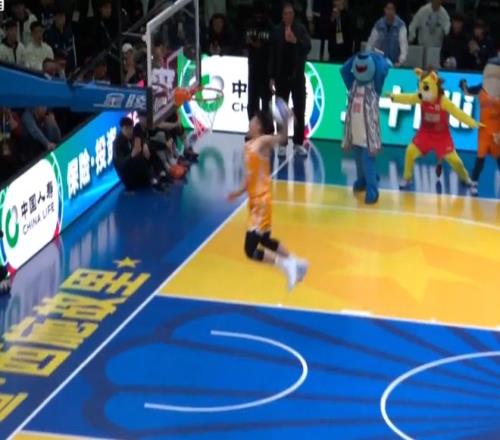 张文杰选择篮下冲出来,大风车转体暴扣,第一次失败,第二次成功,获得46分。