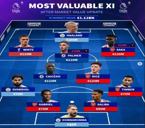 德国转会市场更新了英超球员身价,并列出身价最高的11人阵容,总身价高达11.2亿欧元。曼城前锋哈兰德以2亿欧元领衔,阿森纳成为最大赢家,共有萨利巴(9000万)、加布里埃尔(7500万)、赖斯(1.2亿)、萨卡(1.2亿)和廷伯(7000万)5名球员入选。切尔西的凯塞多(1.1亿)和帕尔默(1.1亿),利物浦的维尔茨(1.1亿)以及曼城的哈兰德、多纳鲁马(4500万)、格瓦迪奥尔(7000万)组成了这套豪华阵容。