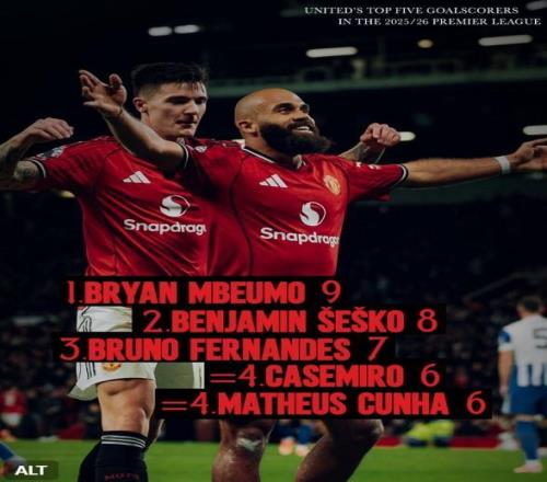 3 - 曼联官方晒队内英超射手榜前五:姆伯莫9球暂居第一