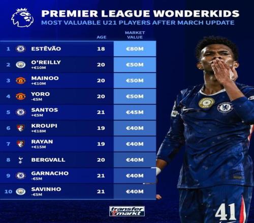 在对英超球员身价进行更新后,德国转会市场盘点了目前英格兰顶级联赛身价最高的U21球员。切尔西18岁边锋埃斯特旺以8000万欧元高居榜首。曼城20岁中场奥赖利与曼联双星梅努、约罗同以5000万欧元并列第二,切尔西21岁中场桑托斯以4500万欧元排名第五。