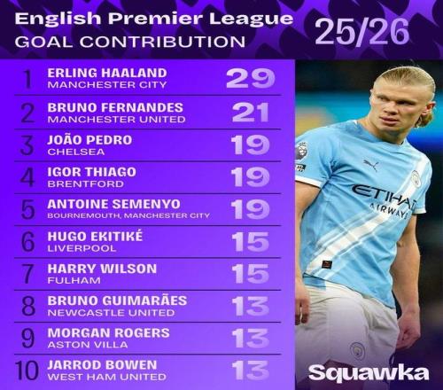 数据机构Squawka统计了本赛季英超球员的参与进球(进球+助攻)数量,并列出榜单。曼城前锋哈兰德以29球高居榜首,展现出恐怖的进攻效率。曼联核心B费以21球位列次席,切尔西前锋若昂·佩德罗与布伦特福德前锋伊戈尔·蒂亚戈、曼城边锋塞梅尼奥同以19球并列第三。