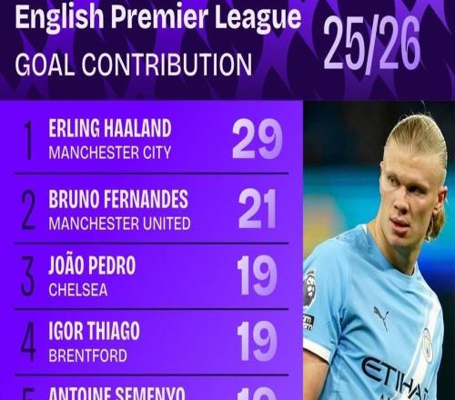 本赛季英超参与进球榜:哈兰德29球居首,B费21球次席 -