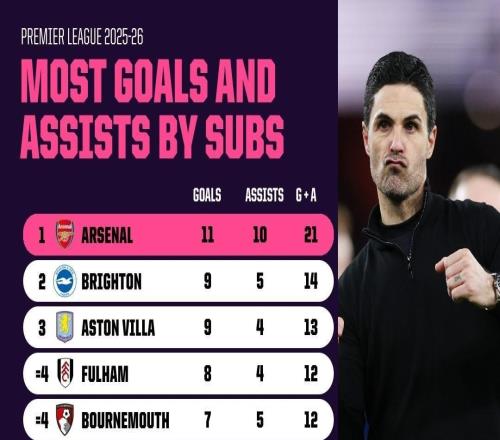 本赛季英超替补参与进球榜:阿森纳21球居首,曼城2球垫底 -