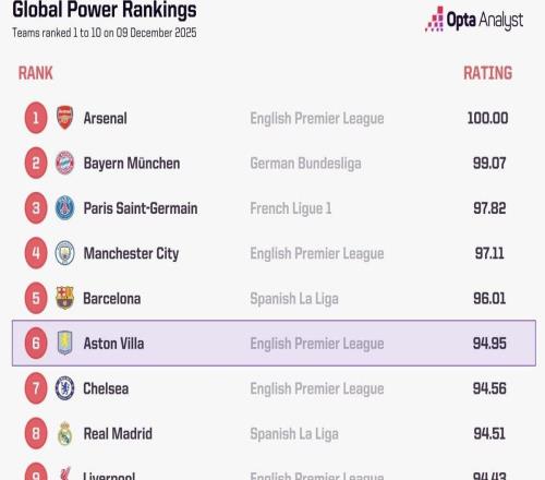 Opta全球俱乐部当前实力榜:阿森纳、拜仁、巴黎前3,维拉第6 -